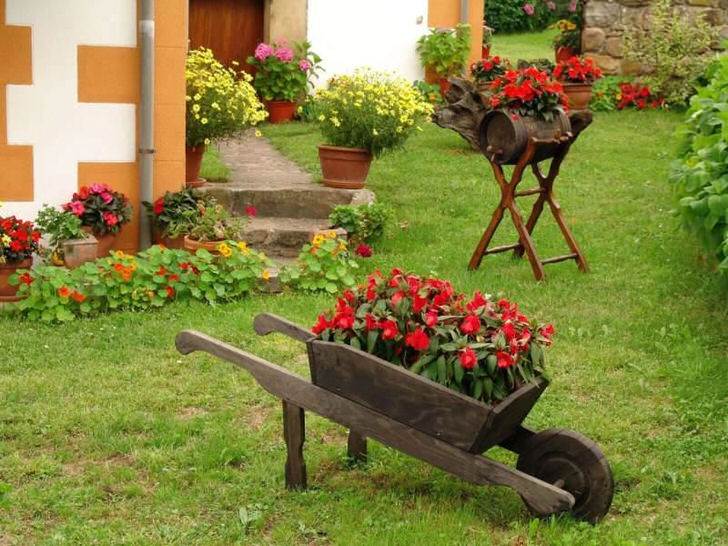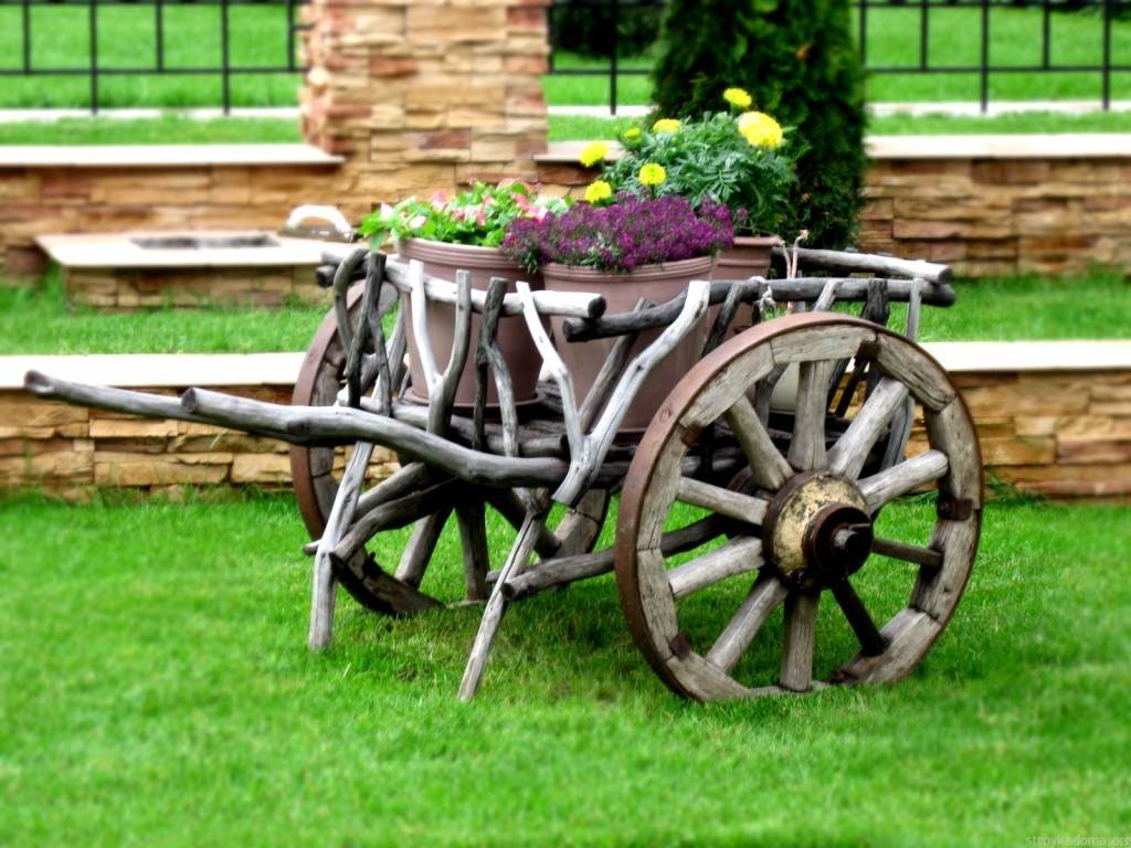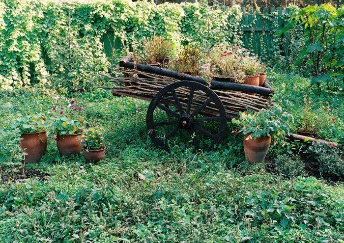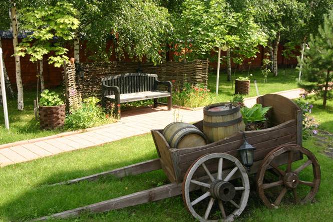 Ультрасовременные изделия, дизайнерские изыски, пёстрые вещи — всё это в деревенском дизайне ландшафта приживается сложно. Здесь приветствуется только натуральность — дерево, камень, глина, предметы деревенской утвари и предметов труда, садовые инструменты.