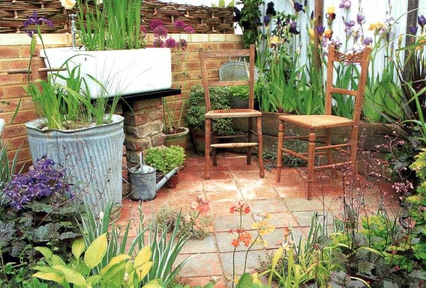 В высадке растений приветствуется естественность обычного деревенского сада. Плодовые растения и кустарники. Также отлично подойдут небольшие грядки с овощами, плетёная изгородь, колодец, изделия ручной работы, искусственный пруд, дорожки с деревянным настилом, деревянные лавочки, простые на вид беседки.