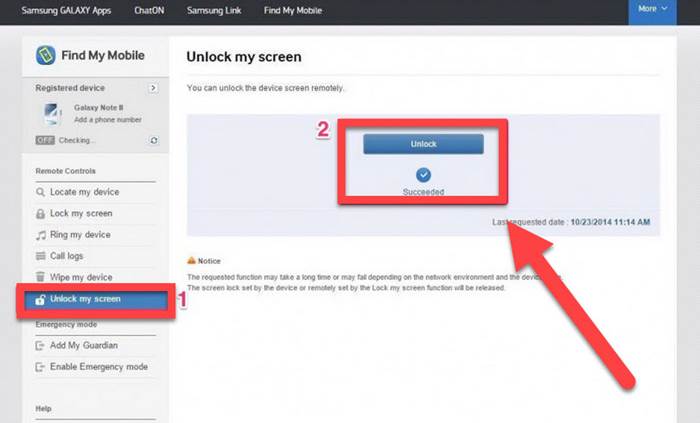 Для разблокировки дисплея через Find My Mobile выполните следующие шаги: