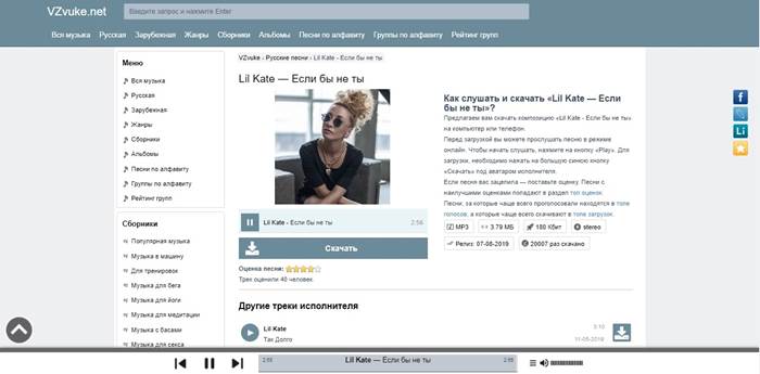 Этот сервис особо приглянется пользователям, которые предпочитают получать бесплатный и быстрый доступ к скачиванию нужных песен. Здесь не нужно проходить регистрацию и приобретать подписку — все проходит в несколько кликов. Просто введите в поисковике название и нажмите на скачивание. Предварительно интересующую вас песню можно прослушать, оценив качество и другие параметры. Также среди плюсов VZvuke можно выделить: