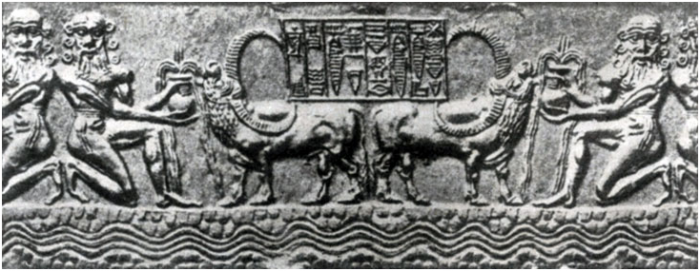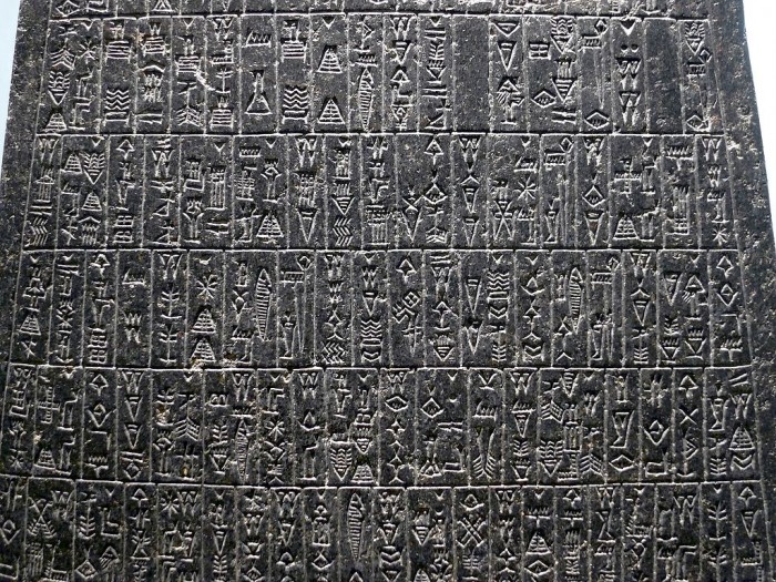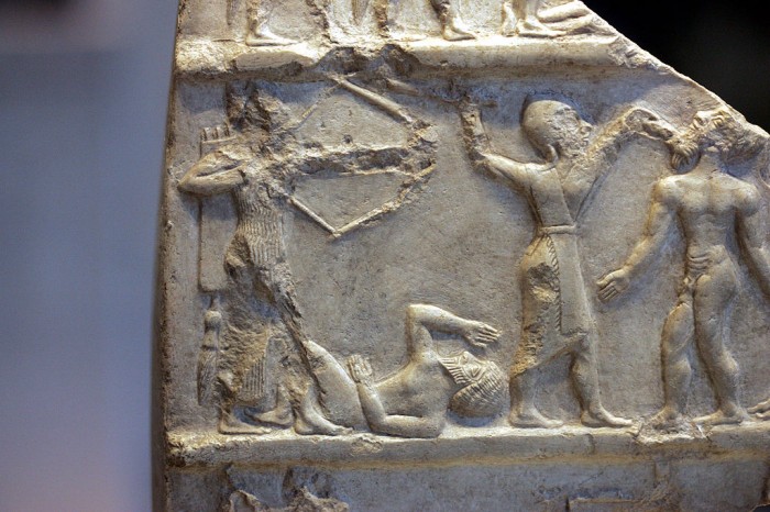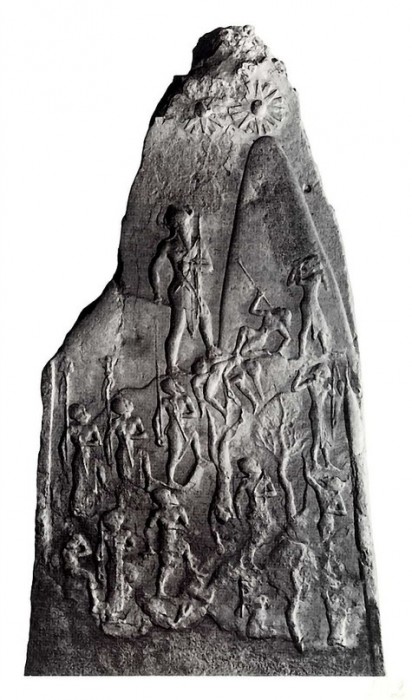 И в глыбах песчаника размером больше человеческого роста, и в цилиндрических печатях размером с большой палец они умели воплощать новые ощущения. Они умели изображать мускулатуру и черты лица более правдоподобно, чем их предшественники. Для возвышения царских завоеваний они первыми стали показывать натуралистический пейзаж в качестве фона на стелах, посвященных победам. На стеле Нарам-Сина, например, показан царь — примерно на треть больше, чем другие персонажи — спускающийся с горы, как по лестнице, по вражеским воинам. В божественной царственности Нарам-Сина не может быть никакой ошибки: на нем рогатая корона, как и у божеств, а звезды над головой представляют богов, подаривших ему победу. То ли это сделала природа, то ли люди, но надписи над его головой оказались стерты. Эламиты захватил и стелу спустя тысячу лет после ее создания и сделали собственные надписи на самой вершине. Другие повреждения видны у основания и в верхней части, где остались следы, по меньшей мере, еще одной звезды.