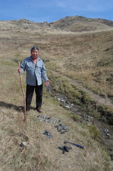 Сам Жакен Таймагамбетов не без восхищения рассказывает о том, как именно была обнаружена драгоценная находка, которая сможет рассказать больше об истории данного края и жизни людей каменного века: «Некоторые мои коллеги говорили, что здесь не может быть стоянок первобытных людей. Но, увы, мне посчастливилось найти такую стоянку. Когда мы проводили разведку, я пошел к роднику, а россияне поднялись в горы повыше искать расположение стоянок, и когда спустился к ручью, я там увидел пластины длинной до 15-20 сантиметров. Они лежали в ручье, как будто кто-то специально их положил. И вот, когда осмотрелся, там выявил еще большое количество этих пластин. Конечно, не было радости предела, я начал всех звать, и мы прямо на поверхности у родника собрали большое количество артефактов. Тут были орудия, ножи — все изготовлено из кремня такого прекрасного качества, зеленого и черного цветов».