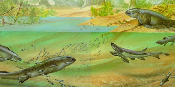 1. Триас или триасовый период. Продолжался от 251 до 201 млн. лет назад. Триас известен тем, что в этот период заканчивается массовое вымирание и начинается постепенное восстановление животного мира Земли. Также в триасовом периоде начинает раскалываться самый большой в истории суперконтинент Пангея.