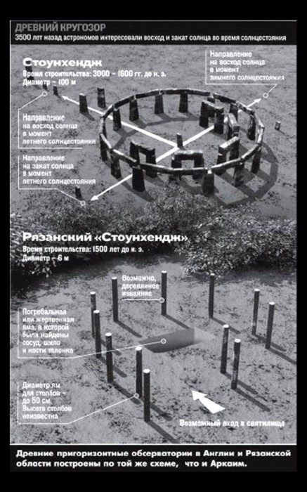 Рязанский Стоунхендж из бревен построен он на холме, в месте впадения в реку Оку речки Прони. Обнаружен он совершенно случайно, как и всякие открытия. Очень привлекателен для поисков был мыс Спасская Лука. Там было сделано немало открытий: древнее поселение времен верхнего палеолита, другие более древние культуры славян. Жили эти народы в самом начале нашей эры, где-то в первом, втором тысячелетии. Построено найденное сооружение так же, как знаменитый Стоунхендж, в виде окружности семиметрового диаметра.