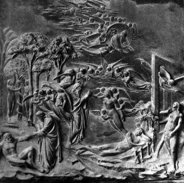 Сотворение Адама и Евы, грехопадение и изгнание из рая. Рельеф третьих дверей флорентийского баптистерия