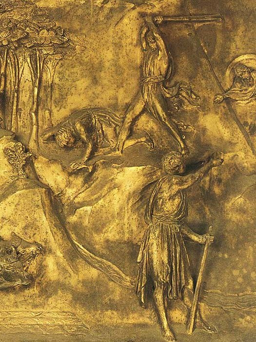 Похоже, в это время Гиберти встретил Леона Батиста Альберти, молодого ученого гуманиста, который, воодушевленный новым искусством во Флоренции, сочинял теоретические трактаты об изобразительном искусстве. Их общая вера в то, что красота является синонимом их понимания античного искусства, затрудняет понимание того, появились ли эти идеи, отраженные в трактате Альберти \’О живописи», раньше, чем они были воплощены в трех панелях вторых дверей (Исаак, Иосиф и Соломон), которые являются наглядным примеров этих идей.