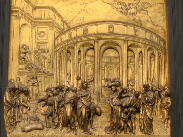 Три панели Гиберти кажутся воплощением гуманистических формулировок изобразительного искусства Возрождения, и ясно, что любая оценка его искусства должна соотноситься как с применением новой теории, так с красотой и прелестью этих работ. Гиберти гордился тем. что он сделал на всех 10 панелях архитектурное оформление в соответствии со зрительным восприятием и настолько реалистичное. что фигуры на переднем плане кажутся крупнее, а на заднем — мельче, как в реальности.
