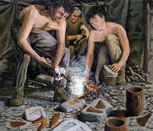 Как известно, холодная ковка меди появилась ещё в предыдущем — медном периоде. Стоит отметить, что учёные до сих пор не могут однозначно ответить, каким образом древним людям удалось догадаться, что медь можно обрабатывать при помощи огня и плавления. Как одно из предположений: кусочки меди, которые оказались в породе или которые остались после холодной ковки, попали в сильный костёр и впоследствии расплавились. Люди это увидели и стали использовать огонь для того, чтобы плавить медь и создавать таким образом более современные изделия. Но и тут возникают вопросы. Дело в том, что температура горения костра достигает разве только 700 градусов, тогда как температура плавления меди превышает 1000 градусов. Случайно ли было открыто плавление меди, например, в результате длительного нахождения кусочков в самом эпицентре возгорания или при горении каких-либо сильногорючих материалов, или каким-то другим способом, но факт остаётся фактом. Люди обнаружили такую особенность меди и придумали новый способ обработки.